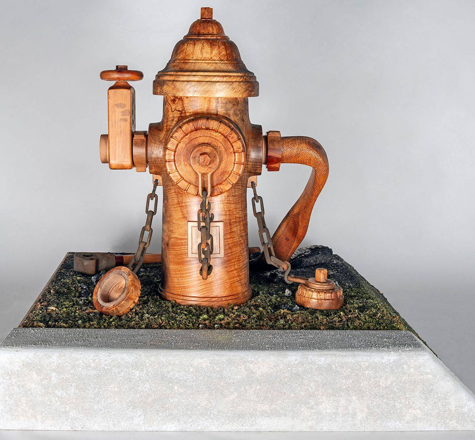 A full size hydrant turned from Big Leaf Maple, hollowed out and fitted with threaded caps, operating gate valve, and hand carved Arbutus chains.